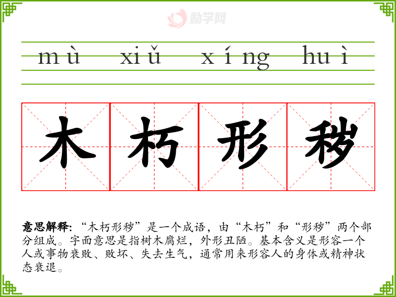 “木朽形秽”是一个成语,由“木朽”和“形秽”两个部分组成。字面意思是指树木腐烂,外形丑陋。基本含义是形容一个人或事物衰败、败坏、失去生气,通常用来形容人的身体或精神状态衰退。