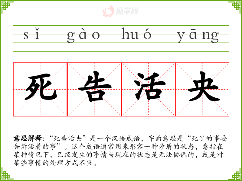 “死告活央”是一个汉语成语,字面意思是“死了的事要告诉活着的事”。这个成语通常用来形容一种矛盾的状态,意指在某种情况下,已经发生的事情与现在的状态是无法协调的,或是对某些事情的处理方式不当。