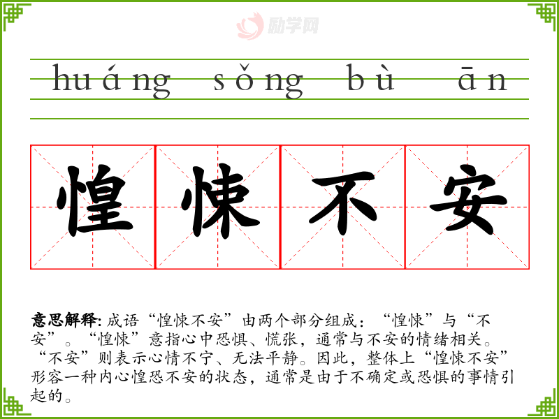 成语“惶悚不安”由两个部分组成:“惶悚”与“不安”。“惶悚”意指心中恐惧、慌张,通常与不安的情绪相关。“不安”则表示心情不宁、无法平静。因此,整体上“惶悚不安”形容一种内心惶恐不安的状态,通常是由于不确定或恐惧的事情引起的。