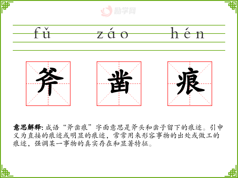 通过对“斧凿痕”的学,我认识到成语不仅是语言的载体,更是文化的反映。它们在语言学和表达中有着重要的地位,能够帮助我们更准确地传达情感和思想,同时也提醒我们珍视传统与历史。