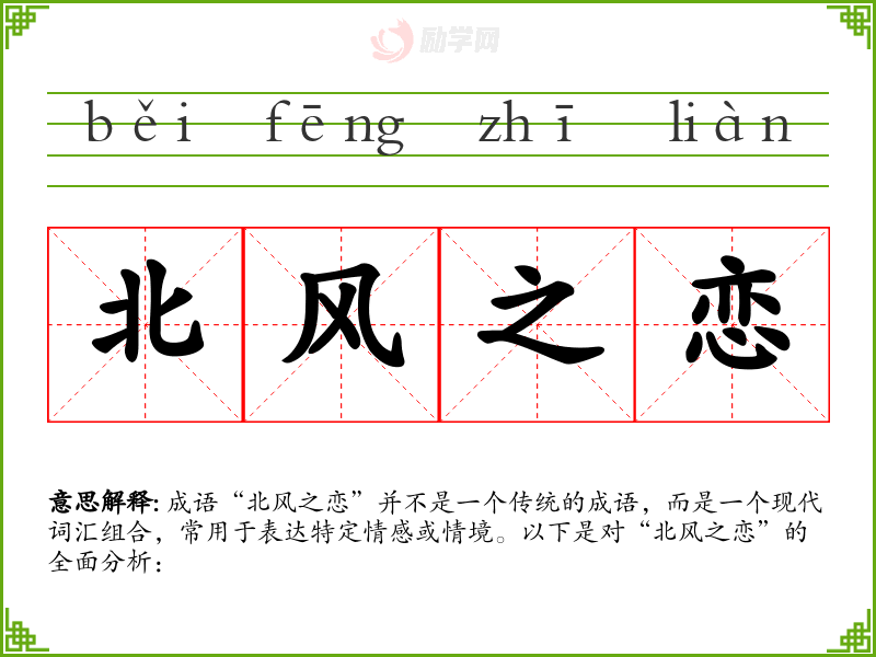 成语“北风之恋”并不是一个传统的成语,而是一个现代词汇组合,常用于表达特定情感或情境。以下是对“北风之恋”的全面分析: