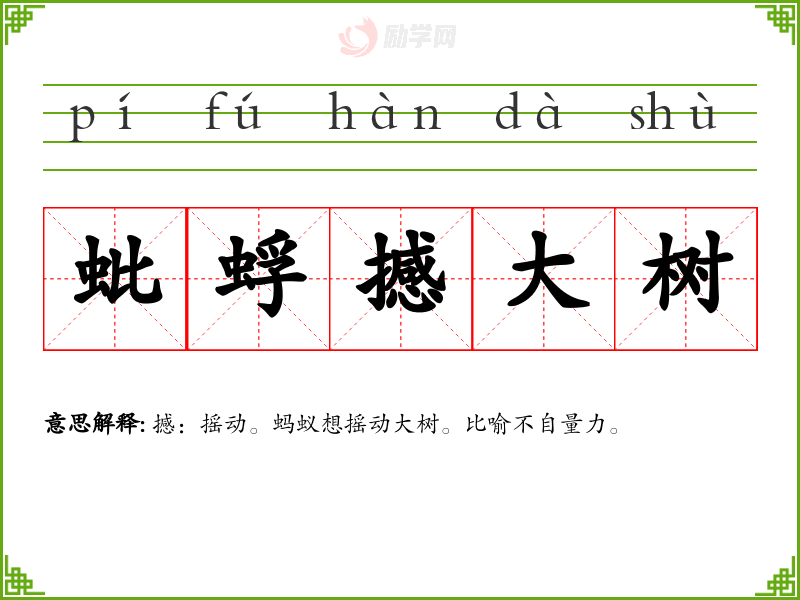 撼:摇动。蚂蚁想摇动大树。比喻不自量力。
