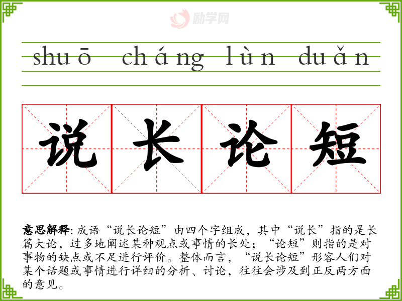 成语“说长论短”由四个字组成,其中“说长”指的是长篇大论,过多地阐述某种观点或事情的长处;“论短”则指的是对事物的缺点或不足进行评价。整体而言,“说长论短”形容人们对某个话题或事情进行详细的分析、讨论,往往会涉及到正反两方面的意见。
