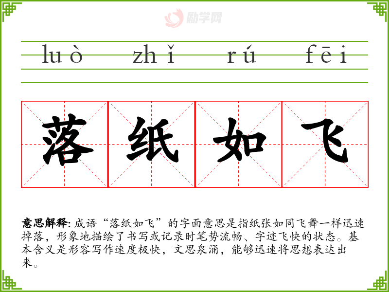 通过对“落纸如飞”的学,我对写作的理解更加深入。它不仅是对写作速度的描述,更是一种对创作状态的追求。在语言学和表达中,能够流畅而快速地表达思想是非常重要的,这个成语激励我不断提高自己的写作能力。