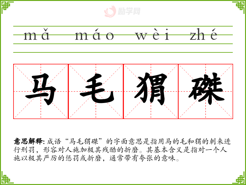 成语“马毛猬磔”的字面意思是指用马的毛和猬的刺来进行刑罚,形容对人施加极其残酷的折磨。其基本含义是指对一个人施以极其严厉的惩罚或折磨,通常带有夸张的意味。