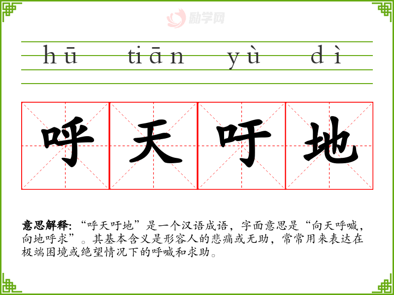 通过对“呼天吁地”的学*,我对其内涵有了更深刻的理解。这一成语不仅丰富了我的语言表达,也让我在面对生活中的挑战时,更能理解他人的痛苦与挣扎。它提醒我们在困境中要勇敢面对,而不是沉溺于绝望。