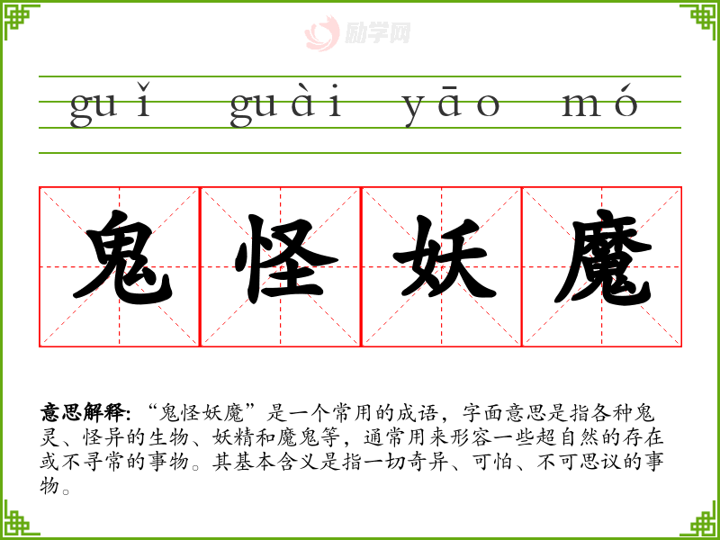 - 日常对话:在日常交流中,人们可以用这个成语来形容某些神秘、不寻常的事情,比如“这地方晚上总有鬼怪妖魔出现,让人不敢靠近”。
