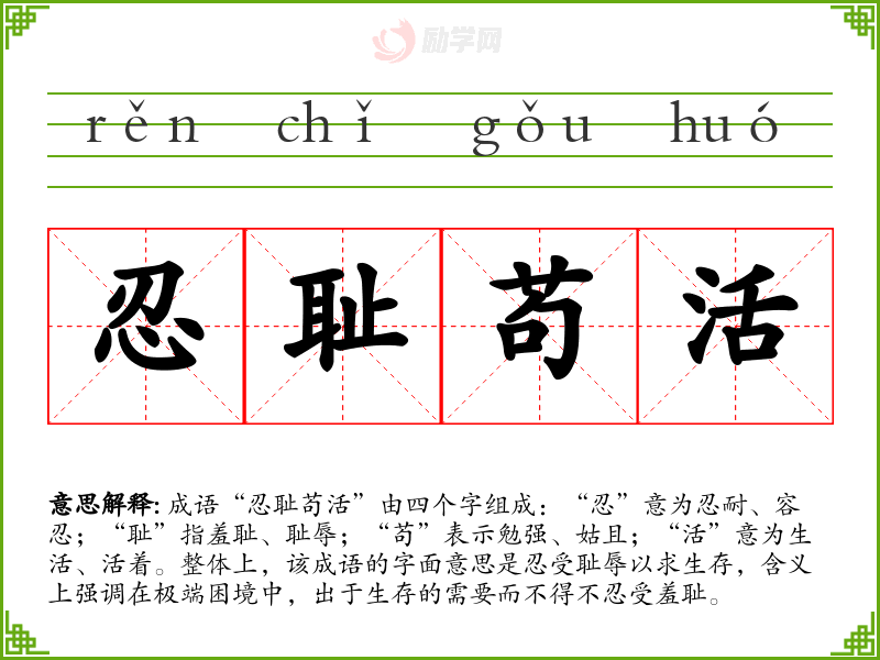 成语“忍耻苟活”由四个字组成:“忍”意为忍耐、容忍;“耻”指羞耻、耻辱;“苟”表示勉强、姑且;“活”意为生活、活着。整体上,该成语的字面意思是忍受耻辱以求生存,含义上强调在极端困境中,出于生存的需要而不得不忍受羞耻。