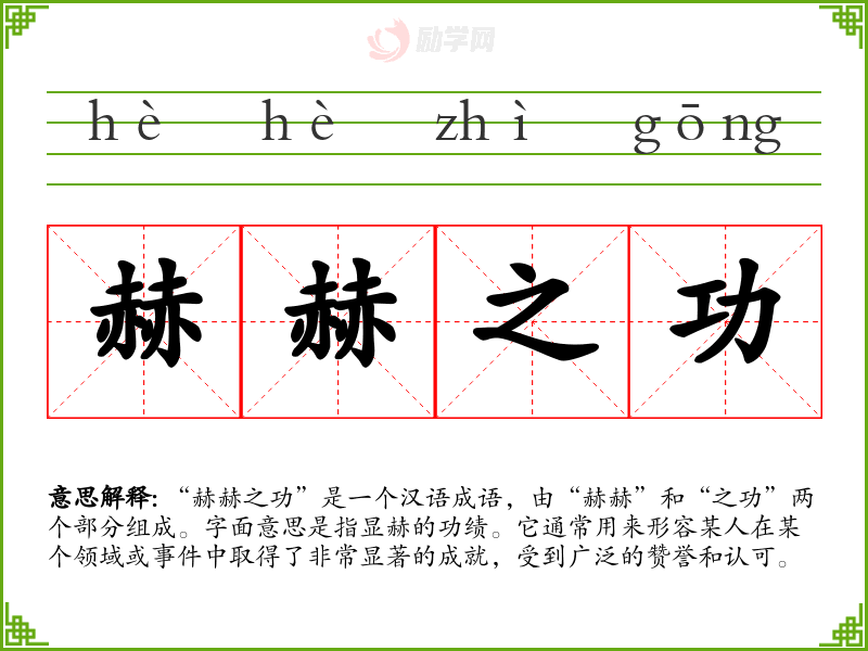 通过对“赫赫之功”的学,我深刻认识到成语在语言表达中的重要性。它不仅能传达出深厚的文化底蕴,还能在日常交流中增强表达的生动性和感染力。在我的语言学和表达中,成语的运用将使我的表达更加丰富和有趣。