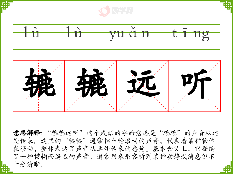 “辘辘远听”这个成语的字面意思是“辘辘”的声音从远处传来。这里的“辘辘”通常指车轮滚动的声音,代表着某种物体在移动,整体表达了声音从远处传来的感觉。基本含义上,它描绘了一种模糊而遥远的声音,通常用来形容听到某种动静或消息但不十分清晰。