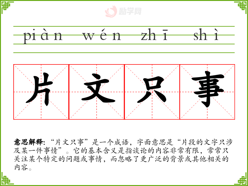 “片文只事”让我联想到在生活中有时我们对某些事情的理解过于简单,忽视了其复杂性。这种片面的理解可能导致错误的判断或决策,提醒我在思考问题时要更加全面和深入。