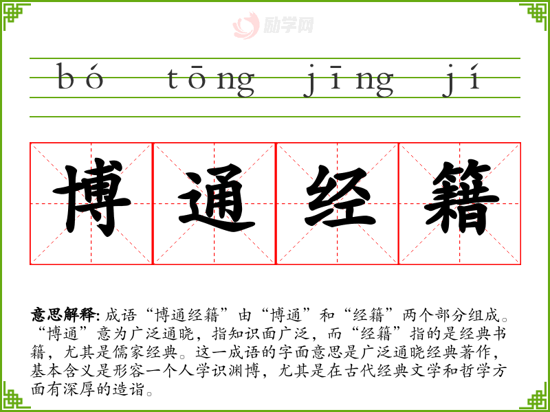 成语“博通经籍”由“博通”和“经籍”两个部分组成。“博通”意为广泛通晓,指知识面广泛,而“经籍”指的是经典书籍,尤其是儒家经典。这一成语的字面意思是广泛通晓经典著作,基本含义是形容一个人学识渊博,尤其是在古代经典文学和哲学方面有深厚的造诣。
