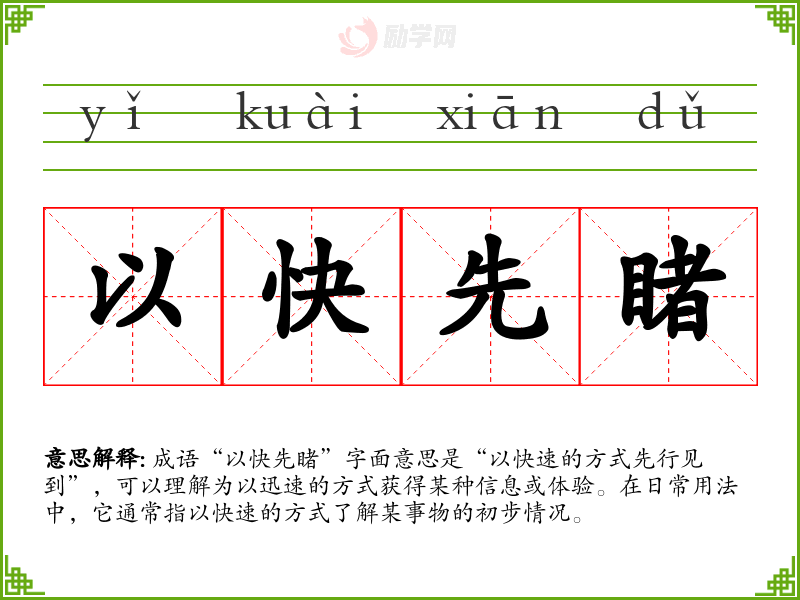 成语“以快先睹”字面意思是“以快速的方式先行见到”,可以理解为以迅速的方式获得某种信息或体验。在日常用法中,它通常指以快速的方式了解某事物的初步情况。