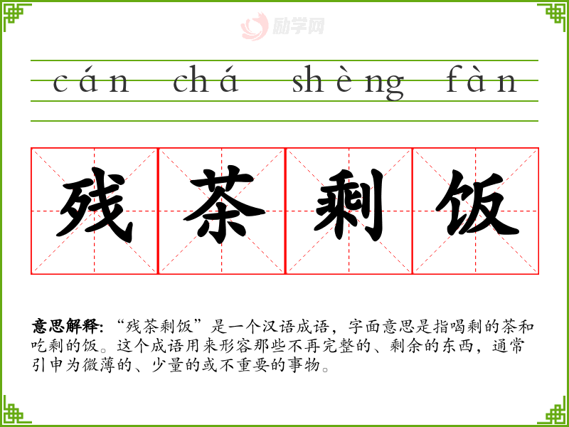 “残茶剩饭”是一个汉语成语,字面意思是指喝剩的茶和吃剩的饭。这个成语用来形容那些不再完整的、剩余的东西,通常引申为微*的、少量的或不重要的事物。