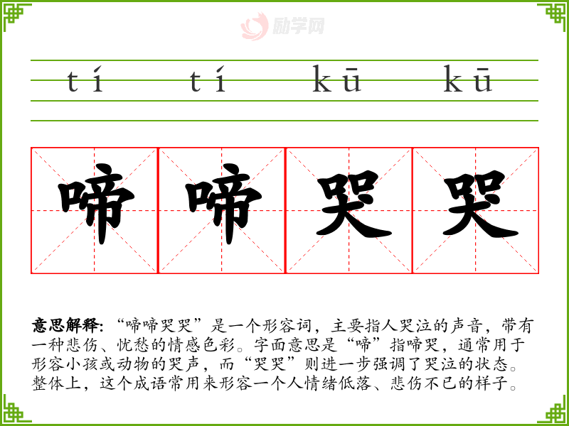 “啼啼哭哭”是一个形容词,主要指人哭泣的声音,带有一种悲伤、忧愁的情感色彩。字面意思是“啼”指啼哭,通常用于形容小孩或动物的哭声,而“哭哭”则进一步强调了哭泣的状态。整体上,这个成语常用来形容一个人情绪低落、悲伤不已的样子。
