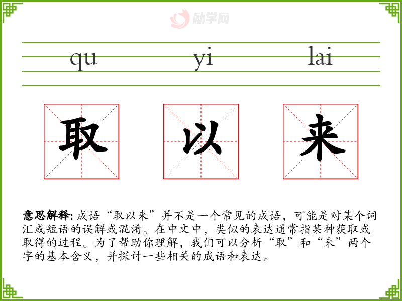 成语“取以来”并不是一个常见的成语,可能是对某个词汇或短语的误解或混淆。在中文中,类似的表达通常指某种获取或取得的过程。为了帮助你理解,我们可以分析“取”和“来”两个字的基本含义,并探讨一些相关的成语和表达。
