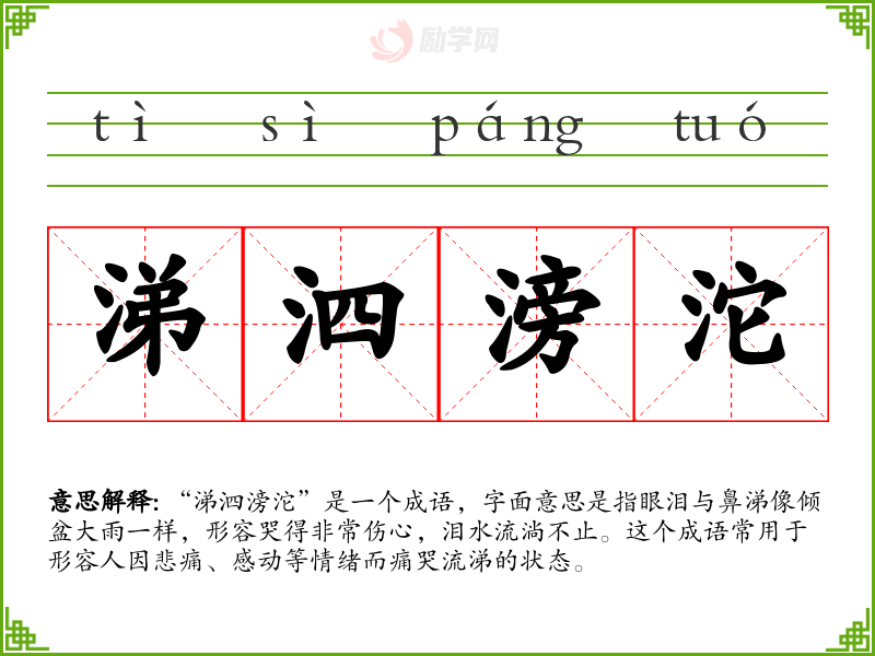 “涕泗滂沱”是一个成语,字面意思是指眼泪与鼻涕像倾盆大雨一样,形容哭得非常伤心,泪水流淌不止。这个成语常用于形容人因悲痛、感动等情绪而痛哭流涕的状态。