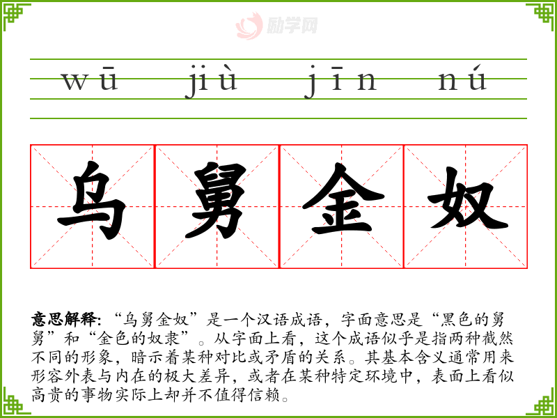 “乌舅金奴”是一个汉语成语,字面意思是“黑色的舅舅”和“金色的奴隶”。从字面上看,这个成语似乎是指两种截然不同的形象,暗示着某种对比或矛盾的关系。其基本含义通常用来形容外表与内在的极大差异,或者在某种特定环境中,表面上看似高贵的事物实际上却并不值得信赖。