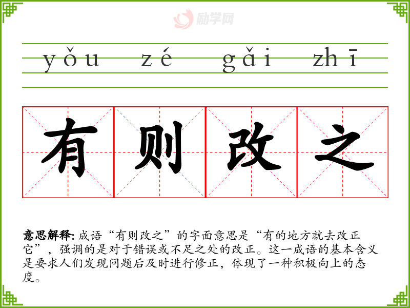 通过对“有则改之”的学,我认识到这一成语不仅是语言的表达,更是生活的哲理。它提醒我们在面对错误和不足时,要有勇气去改正,这是自我提升的关键。在语言学和表达中,掌握这样的成语有助于增强我们的沟通能力和表达深度。