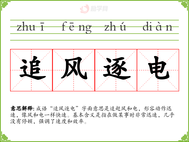 在现代社会,特别是在快节奏的生活和工作环境中,“追风逐电”反映了人们对效率和快速反应的重视。它不仅适用于商业领域,也适用于科技发展和个人成长,强调了在竞争中生存的必要性。