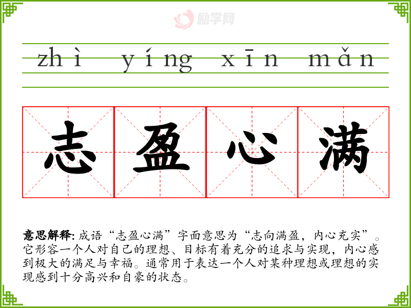 成语“志盈心满”字面意思为“志向满盈,内心充实”。它形容一个人对自己的理想、目标有着充分的追求与实现,内心感到极大的满足与幸福。通常用于表达一个人对某种理想或理想的实现感到十分高兴和自豪的状态。