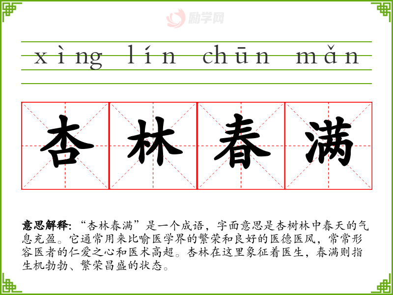 “杏林春满”是一个成语,字面意思是杏树林中春天的气息充盈。它通常用来比喻医学界的繁荣和良好的医德医风,常常形容医者的仁爱之心和医术高超。杏林在这里象征着医生,春满则指生机勃勃、繁荣昌盛的状态。