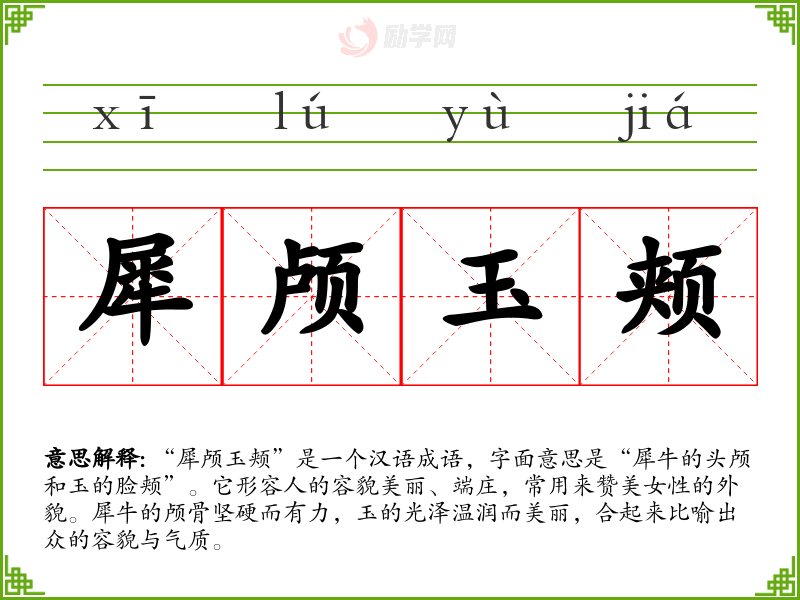 “犀颅玉颊”是一个汉语成语,字面意思是“犀牛的头颅和玉的脸颊”。它形容人的容貌美丽、端庄,常用来赞美女性的外貌。犀牛的颅骨坚硬而有力,玉的光泽温润而美丽,合起来比喻出众的容貌与气质。