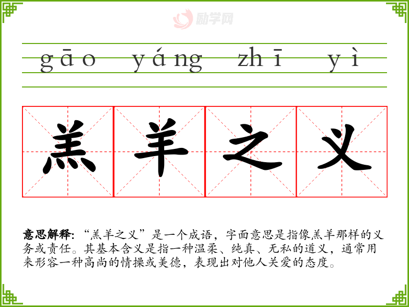 “羔羊之义”是一个成语,字面意思是指像羔羊那样的义务或责任。其基本含义是指一种温柔、纯真、无私的道义,通常用来形容一种高尚的情操或美德,表现出对他人关爱的态度。