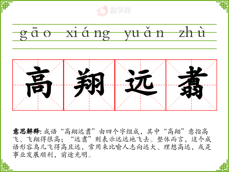 通过对“高翔远翥”这个成语的深入分析,我认识到它不仅仅是一个语言表达,更是一种追求理想、努力奋斗的精神象征。在语言学*和表达中,这样的成语能够丰富我们的词汇,提升我们的表达能力,激励我们在生活中追求更高的目标。