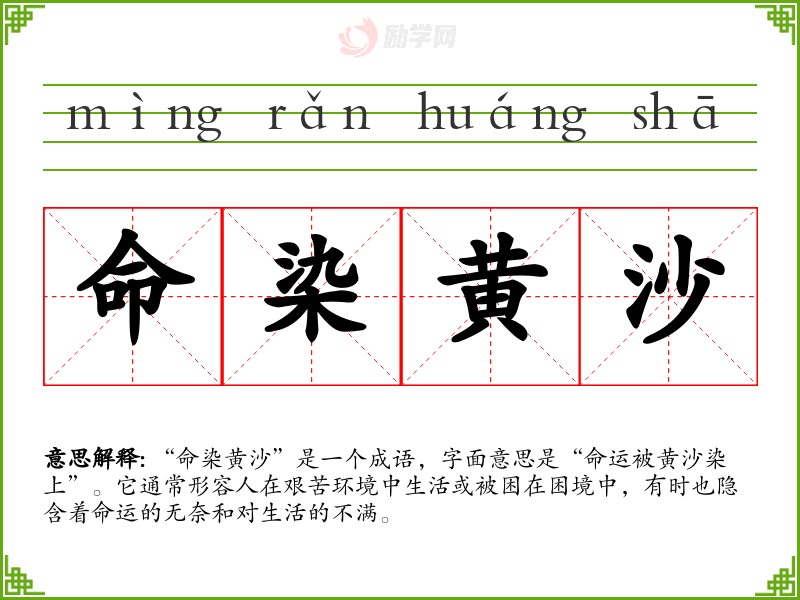 这个成语的具体历史背景和典故并不明确,但可以推测出它与黄沙相关的地域特征,尤其是沙漠或干旱地区的生活环境有关。黄沙常常象征着艰苦和困苦,因此“命染黄沙”可以看作是对困境的隐喻。