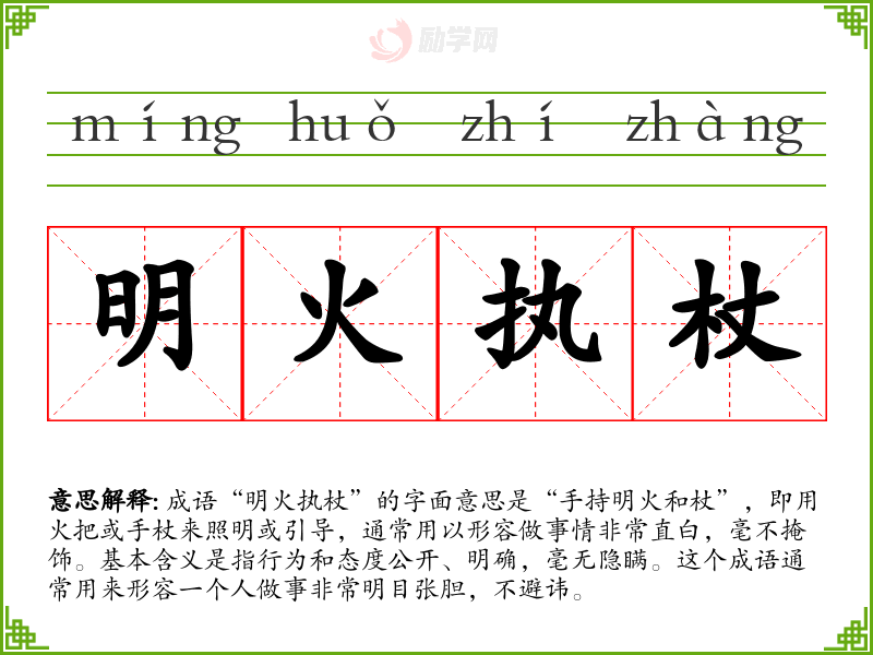 成语“明火执杖”的字面意思是“手持明火和杖”,即用火把或手杖来照明或引导,通常用以形容做事情非常直白,毫不掩饰。基本含义是指行为和态度公开、明确,毫无隐瞒。这个成语通常用来形容一个人做事非常明目张胆,不避讳。