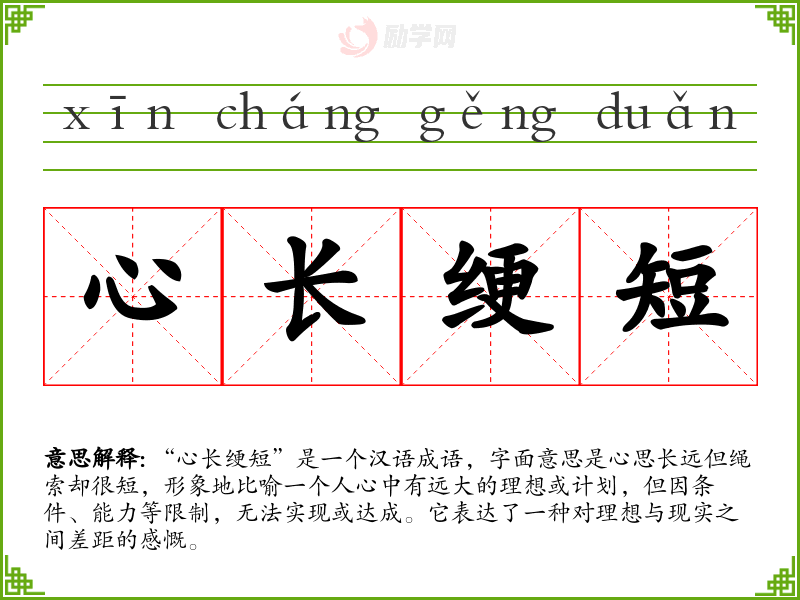 “心长绠短”是一个汉语成语,字面意思是心思长远但绳索却很短,形象地比喻一个人心中有远大的理想或计划,但因条件、能力等限制,无法实现或达成。它表达了一种对理想与现实之间差距的感慨。
