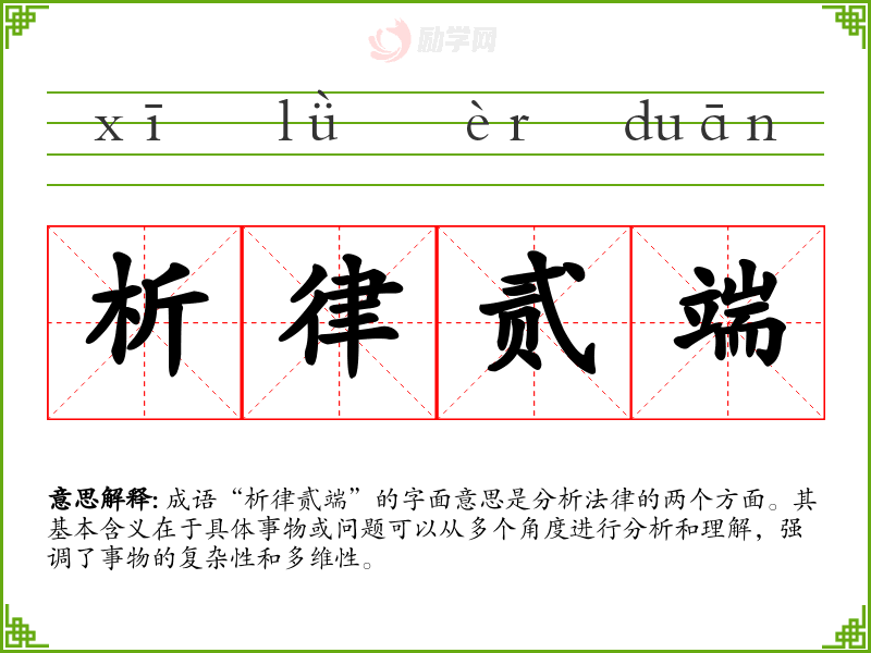对成语“析律贰端”的理解让我意识到,在面对复杂问题时,细致的分析与全面的思考是至关重要的。这不仅在法律领域适用,在日常生活中的决策、沟通中同样适用。因此,培养这种分析能力对我在语言学*和表达中具有重要意义。