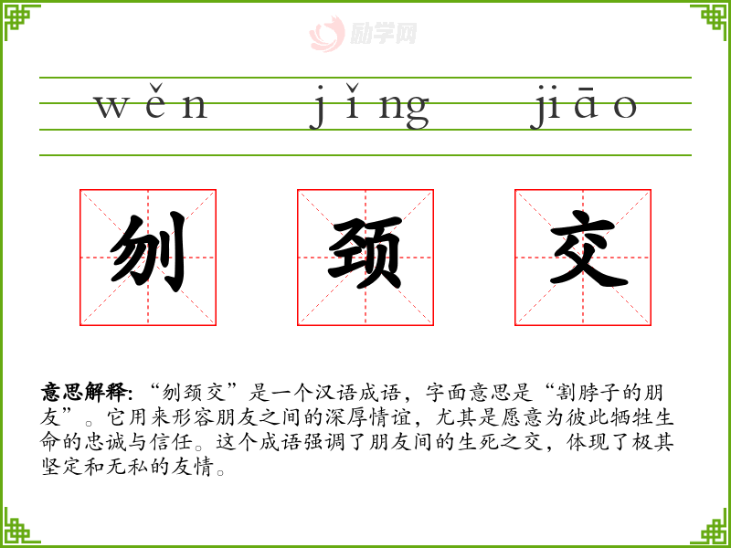 - 演讲:在演讲中提到友情的价值时,可以用“刎颈交”来增强感情的表达。