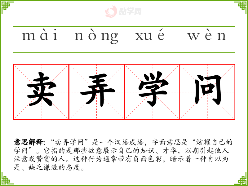 “卖弄学问”是一个汉语成语,字面意思是“炫耀自己的学问”。它指的是那些故意展示自己的知识、才华,以期引起他人注意或赞赏的人。这种行为通常带有负面色彩,暗示着一种自以为是、缺乏谦逊的态度。