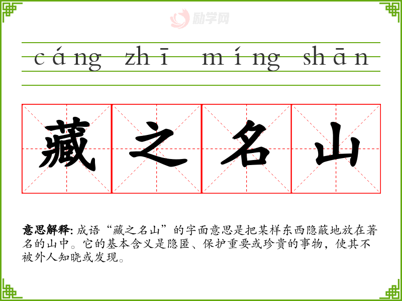 成语“藏之名山”的字面意思是把某样东西隐蔽地放在著名的山中。它的基本含义是隐匿、保护重要或珍贵的事物,使其不被外人知晓或发现。