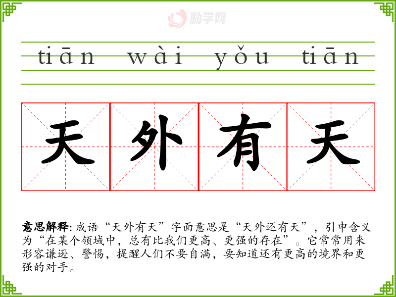 成语“天外有天”字面意思是“天外还有天”,引申含义为“在某个领域中,总有比我们更高、更强的存在”。它常常用来形容谦逊、警惕,提醒人们不要自满,要知道还有更高的境界和更强的对手。