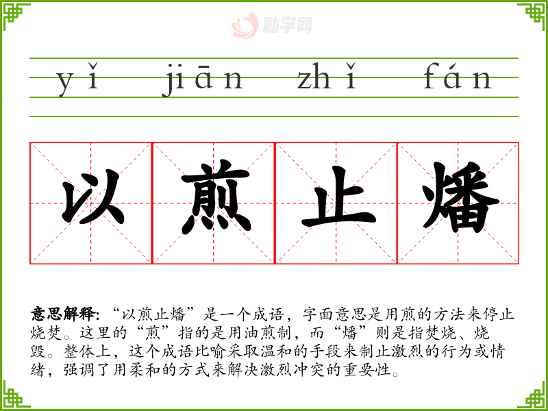 - 在家庭矛盾中,父母常常需要以煎止燔,才能平息孩子间的争吵。