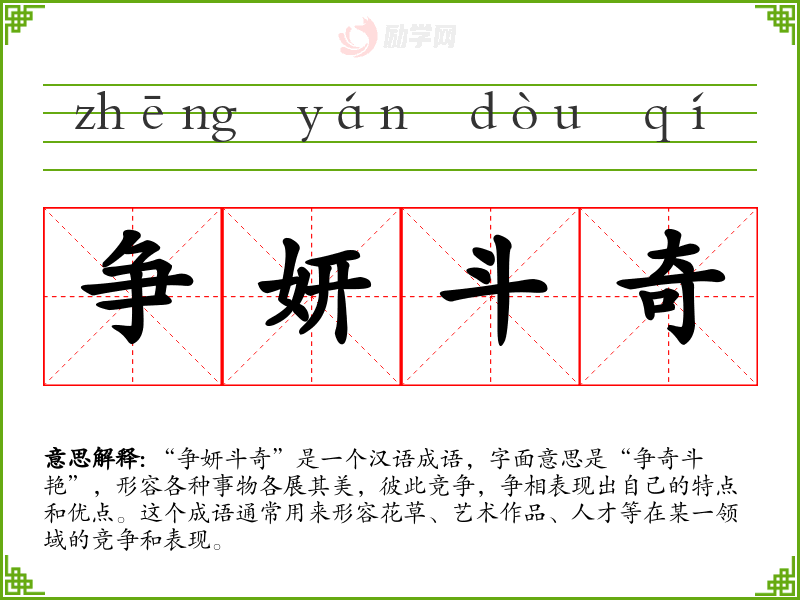 通过对“争妍斗奇”的学,我认识到这个成语不仅仅是对自然景象的描绘,更是一种积极向上的生活态度。它鼓励我们在各自的领域中追求卓越,展示个性。这一成语在语言学和表达中具有重要意义,提醒我们要珍视与他人的竞争与合作。