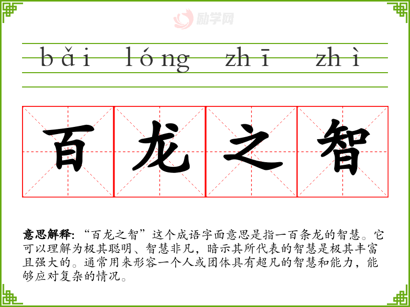 通过对“百龙之智”的学,我认识到智慧不仅仅是个体的表现,更是团队合作的结晶。在语言学和表达中,能够灵活运用这样的成语,不仅能丰富自己的语言表达,也能更好地传达思想,鼓励集体合作与智慧共享。