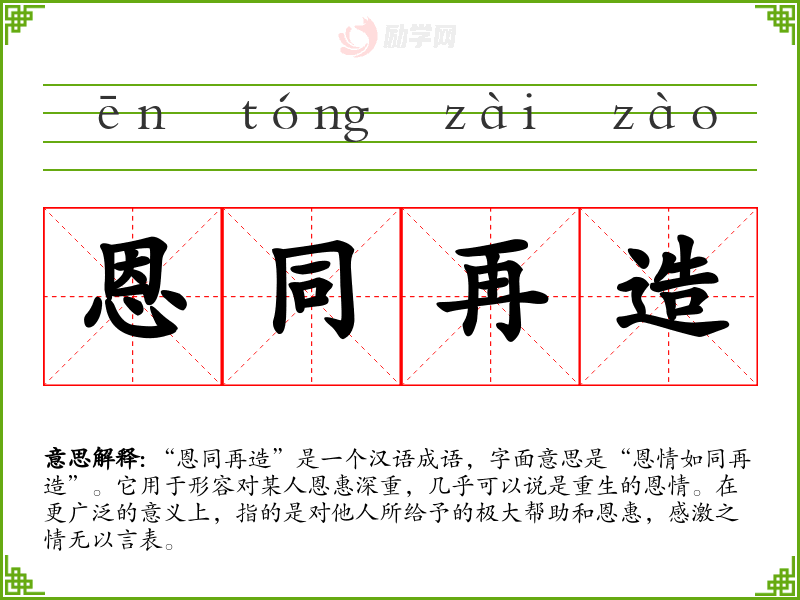 通过对“恩同再造”的学*,我更加理解了感恩在交流中的重要性。这不仅丰富了我的语言表达,也让我在日常生活中更加注重对他人恩情的感激与回报。这一成语不仅是语言的工具,更是传递情感和价值观的重要载体。