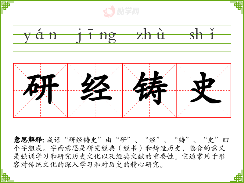 通过对“研经铸史”的学,我意识到它不仅是一种学态度,更是一种文化责任。在语言学*和表达中,这种对历史和经典文献的重视可以帮助我们更全面地理解和传承文化,提升思维深度和表达能力。