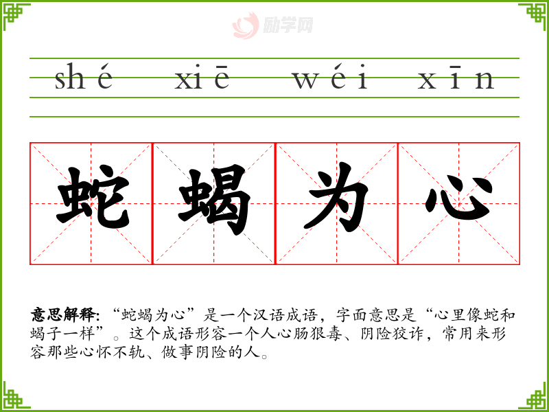 “蛇蝎为心”是一个汉语成语,字面意思是“心里像蛇和蝎子一样”。这个成语形容一个人心肠狠毒、阴险狡诈,常用来形容那些心怀不轨、做事阴险的人。