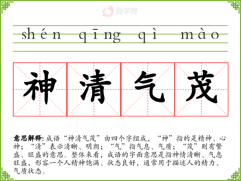 成语“神清气茂”由四个字组成,“神”指的是精神、心神;“清”表示清晰、明朗;“气”指气息、气质;“茂”则有繁盛、旺盛的意思。整体来看,成语的字面意思是指神情清晰、气息旺盛,形容一个人精神饱满、状态良好,通常用于描述人的精力、气质状态。