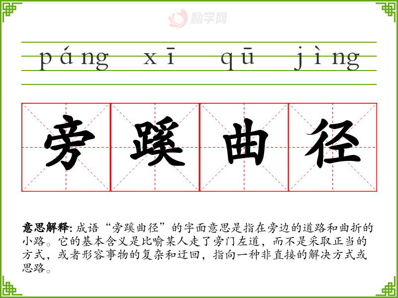 成语“旁蹊曲径”的字面意思是指在旁边的道路和曲折的小路。它的基本含义是比喻某人走了旁门左道,而不是采取正当的方式,或者形容事物的复杂和迂回,指向一种非直接的解决方式或思路。
