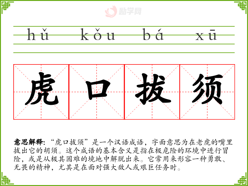 通过对“虎口拔须”的学,我深刻理解到在生活中,面对困难时保持勇气的重要性。这不仅丰富了我的语言表达,也让我在面对挑战时更加自信。这种成语的学帮助我领悟到,勇气和决心在成功路上不可或缺的价值。