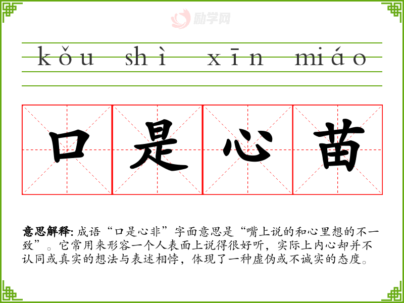 成语“口是心非”字面意思是“嘴上说的和心里想的不一致”。它常用来形容一个人表面上说得很好听,实际上内心却并不认同或真实的想法与表述相悖,体现了一种虚伪或不诚实的态度。