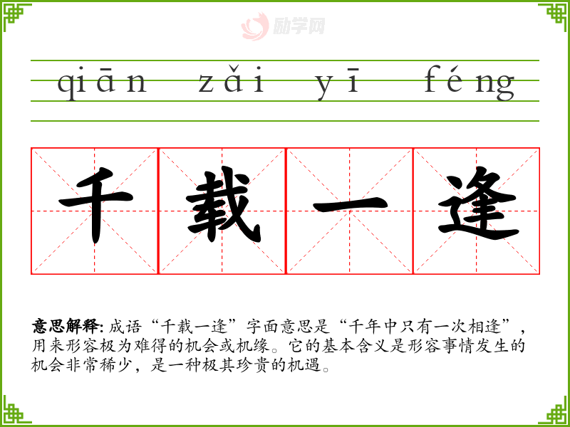成语“千载一逢”字面意思是“千年中只有一次相逢”,用来形容极为难得的机会或机缘。它的基本含义是形容事情发生的机会非常稀少,是一种极其珍贵的机遇。