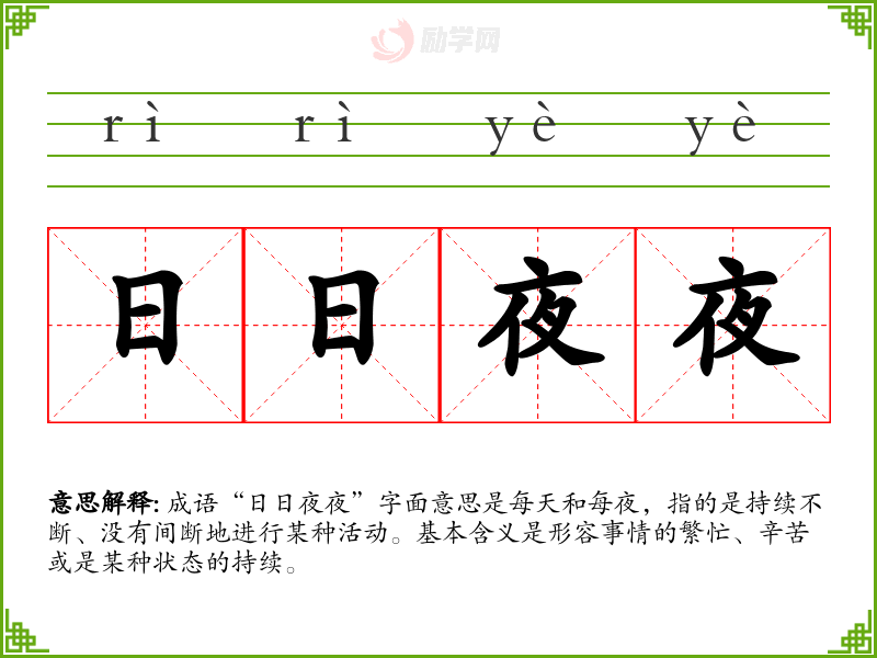 成语“日日夜夜”字面意思是每天和每夜,指的是持续不断、没有间断地进行某种活动。基本含义是形容事情的繁忙、辛苦或是某种状态的持续。