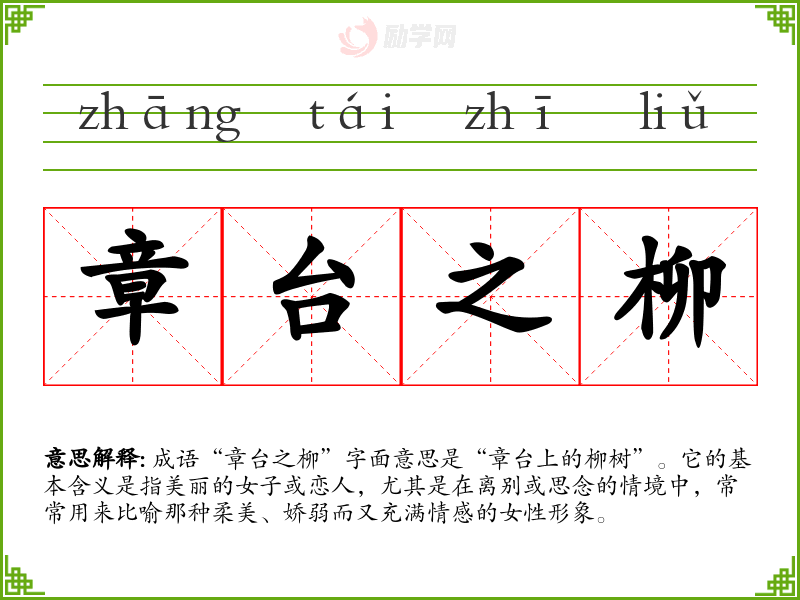 成语“章台之柳”字面意思是“章台上的柳树”。它的基本含义是指美丽的女子或恋人,尤其是在离别或思念的情境中,常常用来比喻那种柔美、娇弱而又充满情感的女性形象。